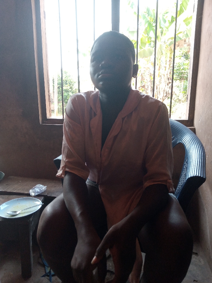 A single individual is seated on a blue plastic chair in an indoor setting located in Okpatu-Ukehe, Nigeria. The individual, of dark complexion and wearing a light pink collared shirt with rolled-up sleeves, faces forward with hands resting in their lap. A window with vertical metal security bars is situated behind and to the left of the subject, providing strong backlighting and revealing dense green foliage, including large leaves resembling banana plants, in the outdoor environment. To the left of the seated individual, on a low wooden stool, rests a white plate containing a spoon and traces of light-colored food or liquid, next to a crumpled clear plastic wrapper. The room's walls exhibit a reddish-brown, textured finish.