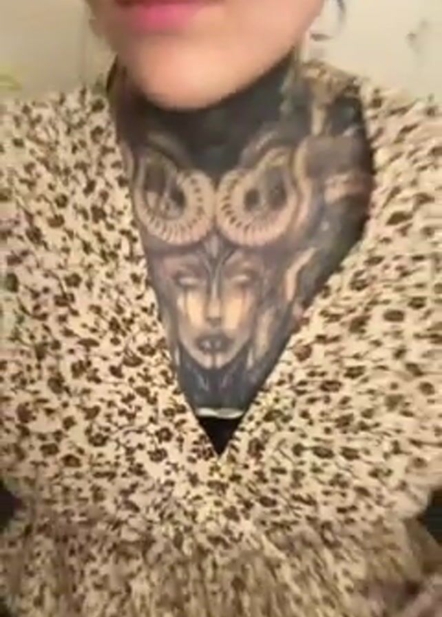 A young woman with fair skin and light eyes, wearing a tan and brown floral print dress, smiles at the camera. She is seated on a dark grey couch. She has a large, black tattoo on her neck and upper chest that depicts a woman with snakes on her head. Her hair is pulled back. The background is a plain white wall.