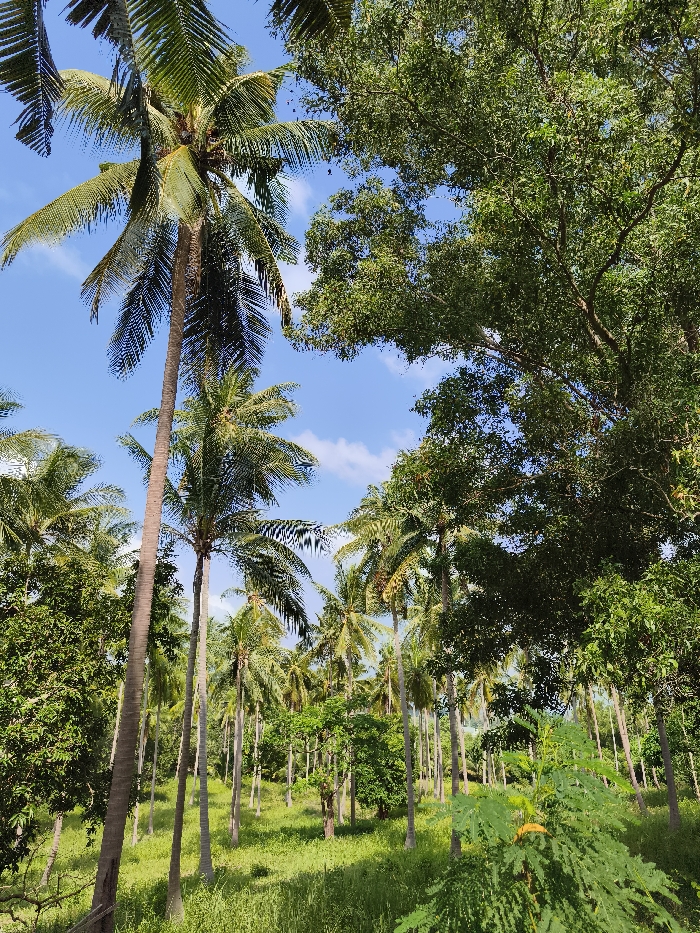 - "Lush green vegetation fills the frame, dominated by numerous coconut palm trees reaching towards a bright blue sky with scattered clouds" by FM-H4hzl2, licensed under CC BY 4.0