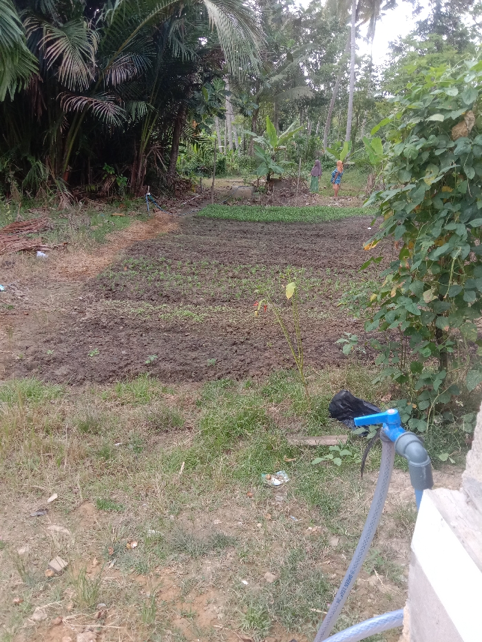The image depicts an outdoor garden or agricultural plot located in Lhokseumawe, Indonesia. In the immediate foreground, a blue plastic spigot, attached to a grey PVC pipe and a flexible hose, is visible on the right, resting on a light-colored block. The ground in the foreground consists of sparse, dry grass and bare earth, with small pieces of scattered debris. A small plant with reddish stems and a few red fruits, consistent with a chili plant, stands centrally in the lower mid-ground. The primary focus of the mid-ground is a rectangular plot of dark, tilled soil, indicating recent cultivation. Within this plot, rows of small, green seedlings are visible. This cultivated area is bordered by a narrow dirt path to the left. The background features dense tropical foliage, including prominent palm trees on the far left and various broadleaf trees, some resembling banana plants, across the rear of the plot. Two individuals are discernible in the far background, standing near the tree line. One person wears a dark-colored head covering and garment, while the other wears an orange or light brown head covering and similar attire. The ambient light suggests an overcast or hazy sky.