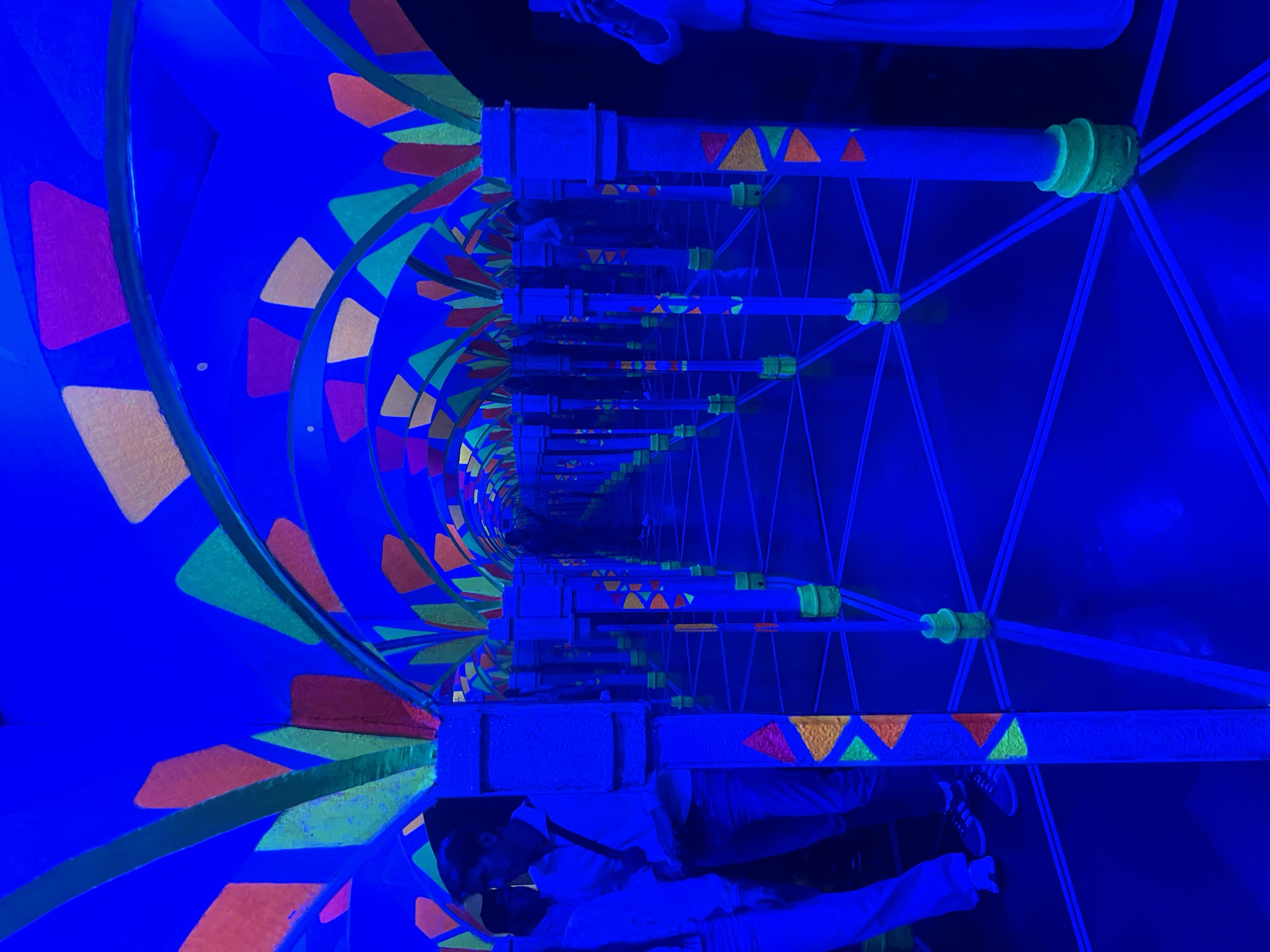 n indoor optical illusion tunnel in an unknown location. The tunnel is illuminated with blue light, and features a repeating pattern of colored squares and triangles along the walls. Support beams run along the length of the tunnel, connected by triangular frames. Two people are visible within the tunnel, their images reflected and distorted.