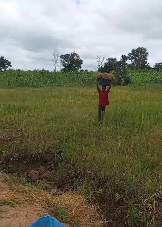 A rural outdoor scene. A boy wearing a red shirt and dark pants walks across a green field, carrying a container of straw on his head, in the direction of a person spreading straw on a white tarp. To the side of the tarp is a blue tarp. The sky is overcast and there are trees in the background.