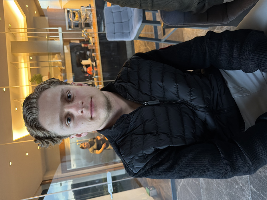 A fair-skinned man with light brown hair and blue eyes is angled to the left, wearing a black quilted vest over a black knit sweater. The vest is zipped up. He is seated in what appears to be a modern restaurant or cafe. There is a gray chair visible behind him. The background is blurred but shows interior lighting, furniture, and reflections in glass.