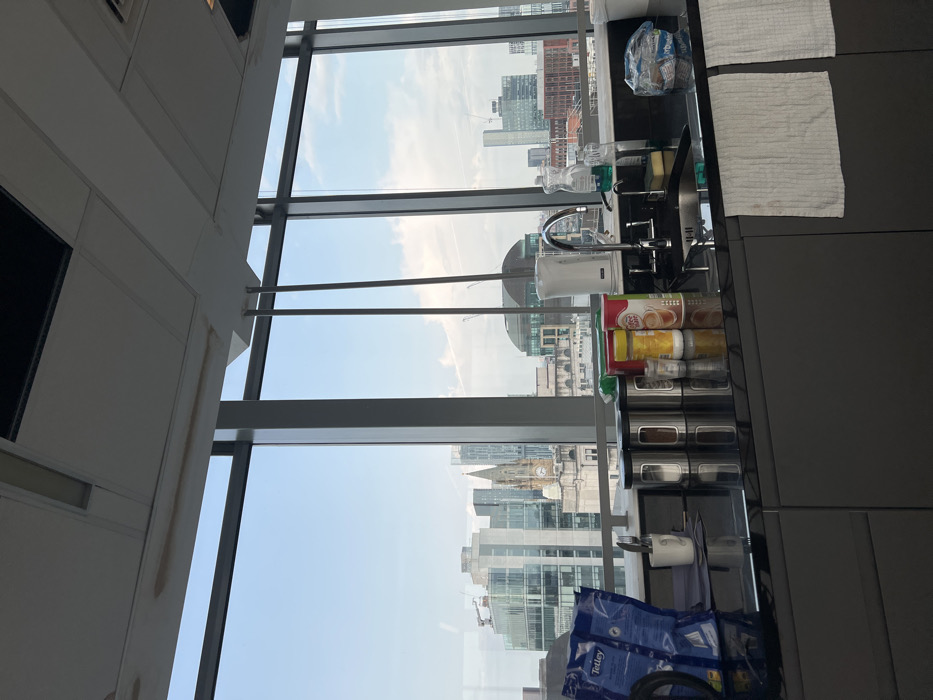 A high-rise apartment view through large windows reveals a cityscape under a bright sky