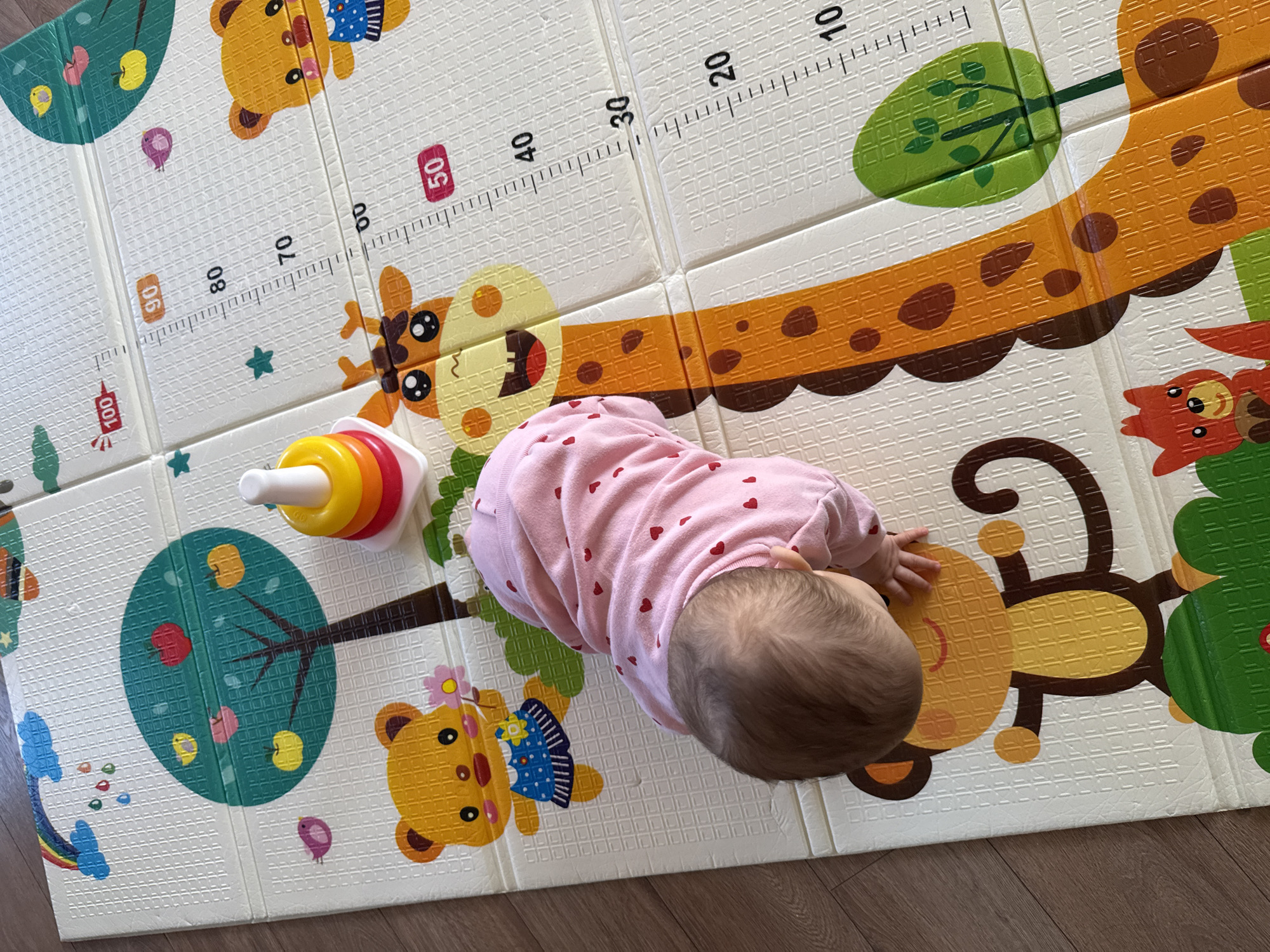 A baby is lying on a play mat, wearing a pink top with red hearts. The play mat is composed of interlocking foam tiles with colorful animal designs and a height chart. A stacking toy sits near the baby. The photo appears to be taken indoors, with a wooden floor visible in the background. There is no information to connect the image to the city of Sofia, Bulgaria.