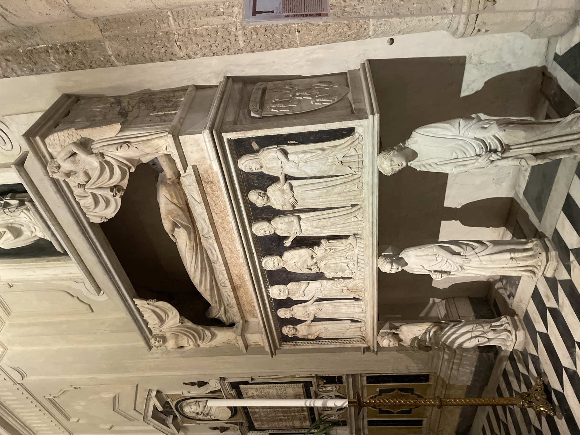The image depicts a large, multi-tiered funerary monument located within the Basilica di Santa Chiara in Naples, Italy. The monument is constructed from light-colored stone, likely marble, and is positioned against a cream-colored wall above a checkered floor composed of black and white squares and triangles. The uppermost section of the monument features a recumbent effigy of a draped figure, presumably male, with a beard and crossed hands, resting within a recessed archway. Above this figure, two winged, draped figures appear to support a central element. Flanking the effigy, two standing, draped figures on pedestals pull back fabric drapes. Below this, a rectangular frieze panel displays eight relief-carved figures, predominantly women, dressed in historical garments. They stand in various poses, with one figure seated towards the center. To the right of this panel, a heraldic shield with multiple small figures in relief is affixed. At the base of the monument, on the checkered floor, three full-length, freestanding statues of draped figures are positioned. The figure on the far right holds an elongated object, possibly a staff or rope. To the left of the monument, a tall, ornate golden candelabrum holds a single white candle. Further left on the wall, a rectangular inscribed plaque with a small bust relief above it is visible. To the right of the monument, a rough-hewn stone column is present, bearing a partially visible informational panel with text including "Basilica di Santa Chiara." Artificial lighting illuminates the scene, casting distinct shadows from the freestanding statues and the candelabrum.