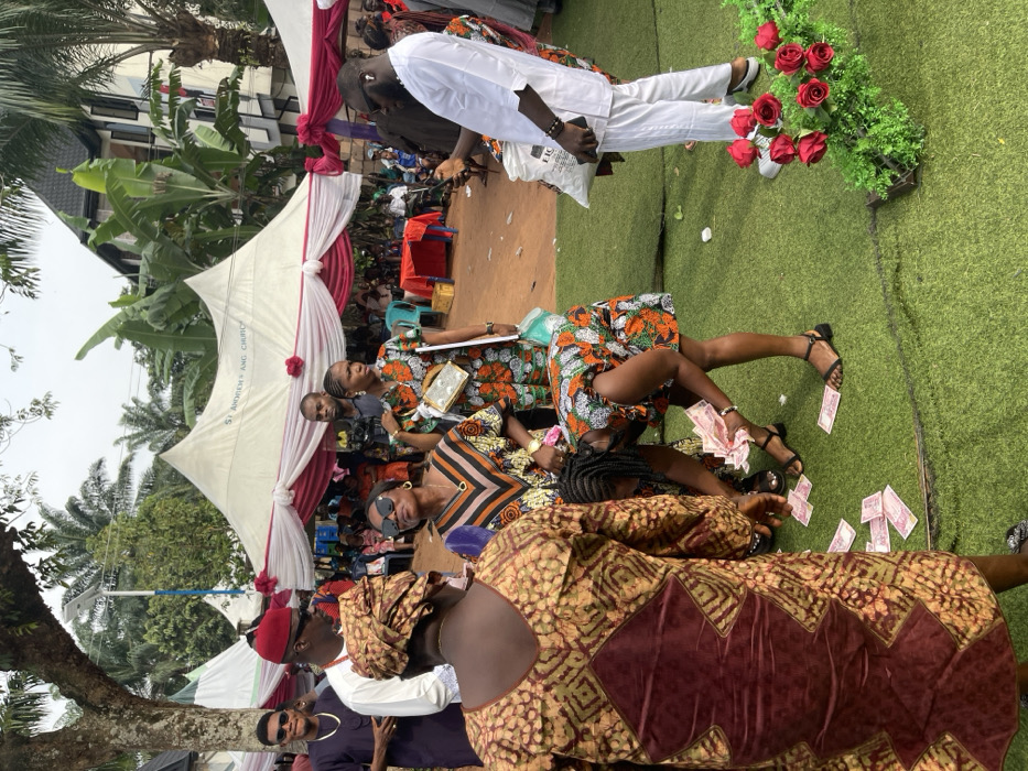 A group of women in colorful African print dresses lie on the grass. Money surrounds them on the ground. A man stands in a white suit, looking down at them. In the background, a large tent decorated with red and white fabric is visible. Other people are gathered nearby, adding to the festive atmosphere. The scene appears to be outdoors, possibly at a wedding or other celebration.