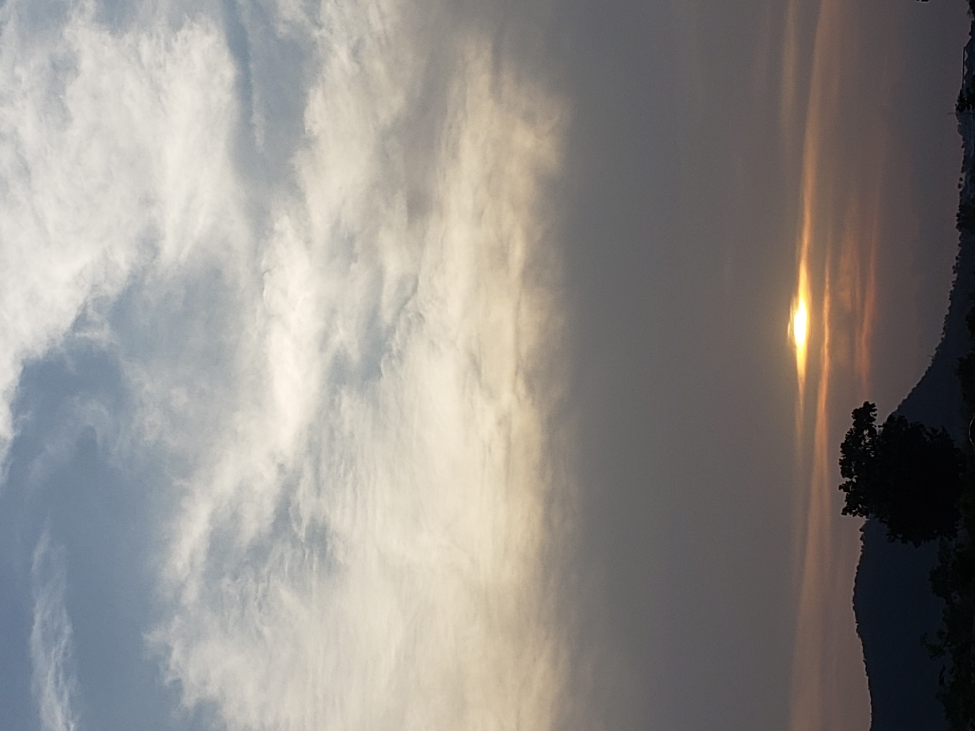 The image displays a low-angle exterior view of a landscape at either sunrise or sunset in Adankolo, Nigeria. The sky occupies the upper two-thirds of the frame, featuring light blue patches with wispy white clouds at the very top. Below, a broad horizontal band of lighter, yellowish-white clouds transitions into a darker greyish-purple layer further down. A distinct, horizontally elongated disc of intense yellow-orange light, identified as the sun, is positioned low in the sky, slightly to the left of the vertical center, partially obscured by the lower cloud strata. The lower third of the image reveals a dark-silhouetted mountainous or hilly horizon. In the mid-ground, a prominent, dark-silhouetted tree with a dense canopy stands, positioned in front of the mountain range and slightly to the left of the sun. Faint, dark silhouettes of distant structures are discernible on the far right along the horizon. No individuals, explicit actions, or direct interactions are visible.