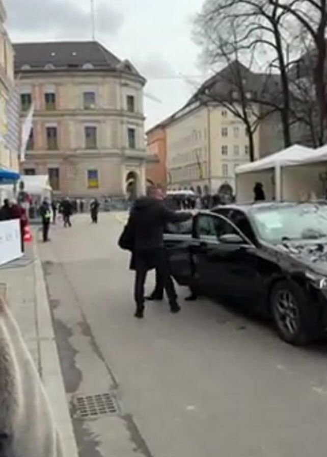 man in a black suit getting out of the back seat of a black car on a city street. Another man in a black coat assists him. The suited man walks past the camera toward a crowd of people. In the background are several buildings and tents with people standing around. Ukrainian flags are displayed on one of the buildings. The weather appears overcast.