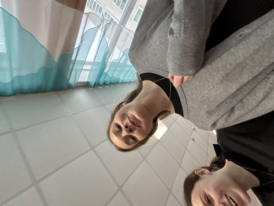 Two women are in the frame, seemingly captured from a low angle. The first woman, positioned higher in the frame, looks downwards with a slight smile. The second woman, partially visible in the lower portion, is smiling broadly. Both are wearing dark tops under grey sweaters. A window with a patterned curtain is visible in the background. The surroundings suggest a room with tiled walls.