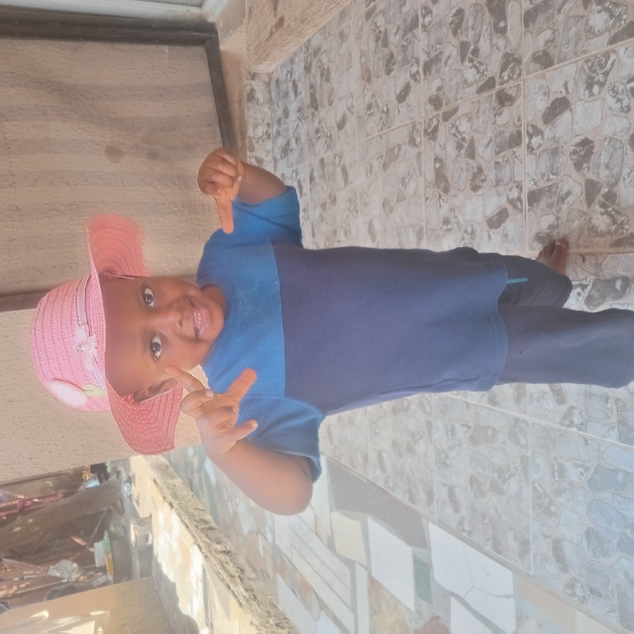 A young child stands on a patterned tiled surface, facing forward, in Sabon Tasha, Nigeria