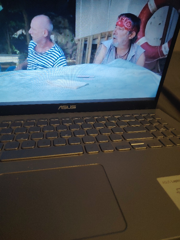 The image displays an ASUS laptop, dark grey in color, with its screen actively showing video content. The laptop's keyboard and touchpad occupy the lower half of the photograph. The video on the screen depicts an outdoor scene, presumed to be set in the city of Izvor, Bulgaria, featuring two adult males. The male subject on the left is bald, wears a horizontal blue and white striped shirt, and is observed looking to his left. The male subject on the right possesses dark hair, a beard, and wears a red bandana with white patterns, a light-colored sleeveless shirt, and a necklace. A tattoo is visible on his left arm. He is depicted looking slightly upwards and to his right with an open mouth. Both individuals are partially obscured from the waist down by a light blue fabric or tarp covering a surface in the video's foreground. Two small, light-colored, rectangular objects are visible on this fabric. In the background of the video content, greenery and wooden structures are discernible, alongside a red and white lifebuoy positioned to the right of the man wearing the bandana. The actual environment surrounding the laptop is dimly lit.