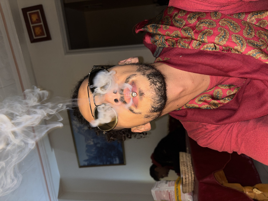 A man with dark hair and a beard wears round sunglasses and red clothing with a patterned lining. He is exhaling smoke from his mouth, and a small, shiny object is visible on his lip. The room appears to be indoors, with framed pictures on the wall. Another person's head and shoulders are faintly visible in the background. The image is oriented sideways.