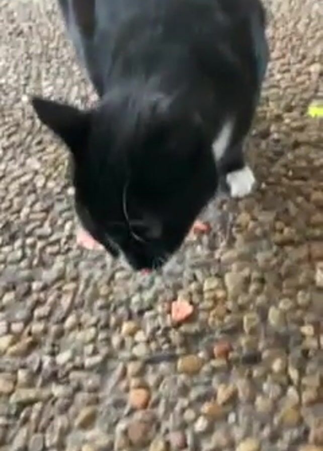 - "A black and white cat stands on a surface covered with small pebbles and eats pieces of meat scattered around it" by FM-eaIFt1, licensed under CC BY 4.0