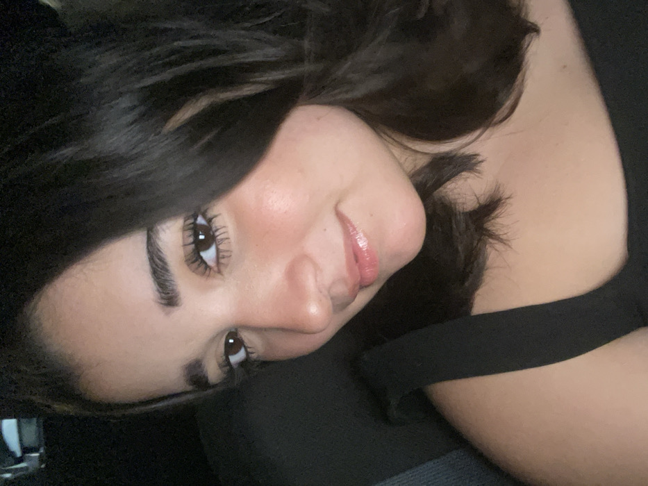 The image depicts a close-up portrait of a female individual, likely in her late teens or early twenties, within a low-light environment, possibly a vehicle interior. She has medium-dark, wavy hair, brown eyes, and prominent eyelashes. Her skin tone is light to medium, exhibiting blush on the cheeks. Her lips are slightly parted, appearing glossy with a pink tint. She wears a black sleeveless garment, with one shoulder strap visible on her left side. Her expression is a soft, natural smile, and her gaze is directed generally towards the viewer's right. The background is dark and out of focus, containing a blurred grey element on the far left, consistent with interior upholstery or a seatbelt. The image lacks visual identifiers to establish a specific location within Coatzacoalcos, Mexico.