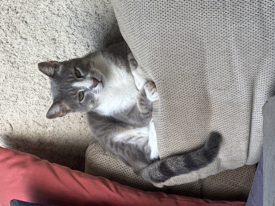 - "A grey and white tabby cat is seated centrally on a light beige, woven-textured cushion in Beit Yitshak Sha'ar Hefer, Israel" by FM-RIphO2, licensed under CC BY 4.0