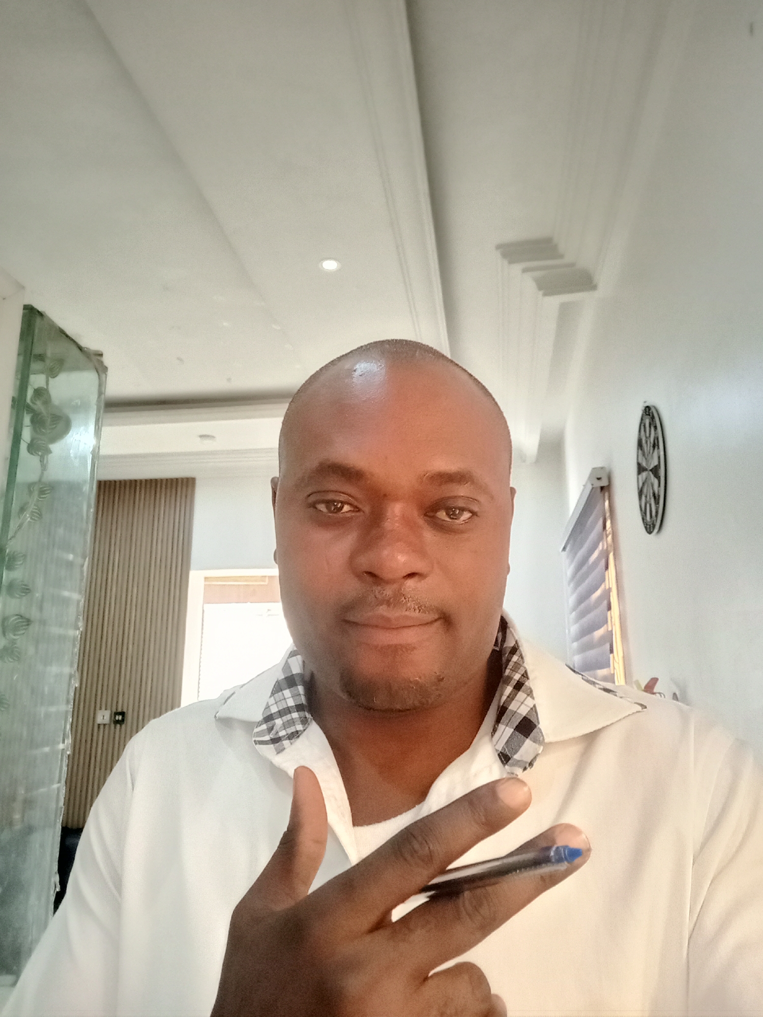 A medium shot of a dark-skinned bald man holding a pen in his left hand. He is wearing a white shirt with a plaid collar and is indoors. Behind him is a wall with a decorative clock and a window with blinds. To his left is a glass partition. The image was taken at Gwarinpa, Nigeria.