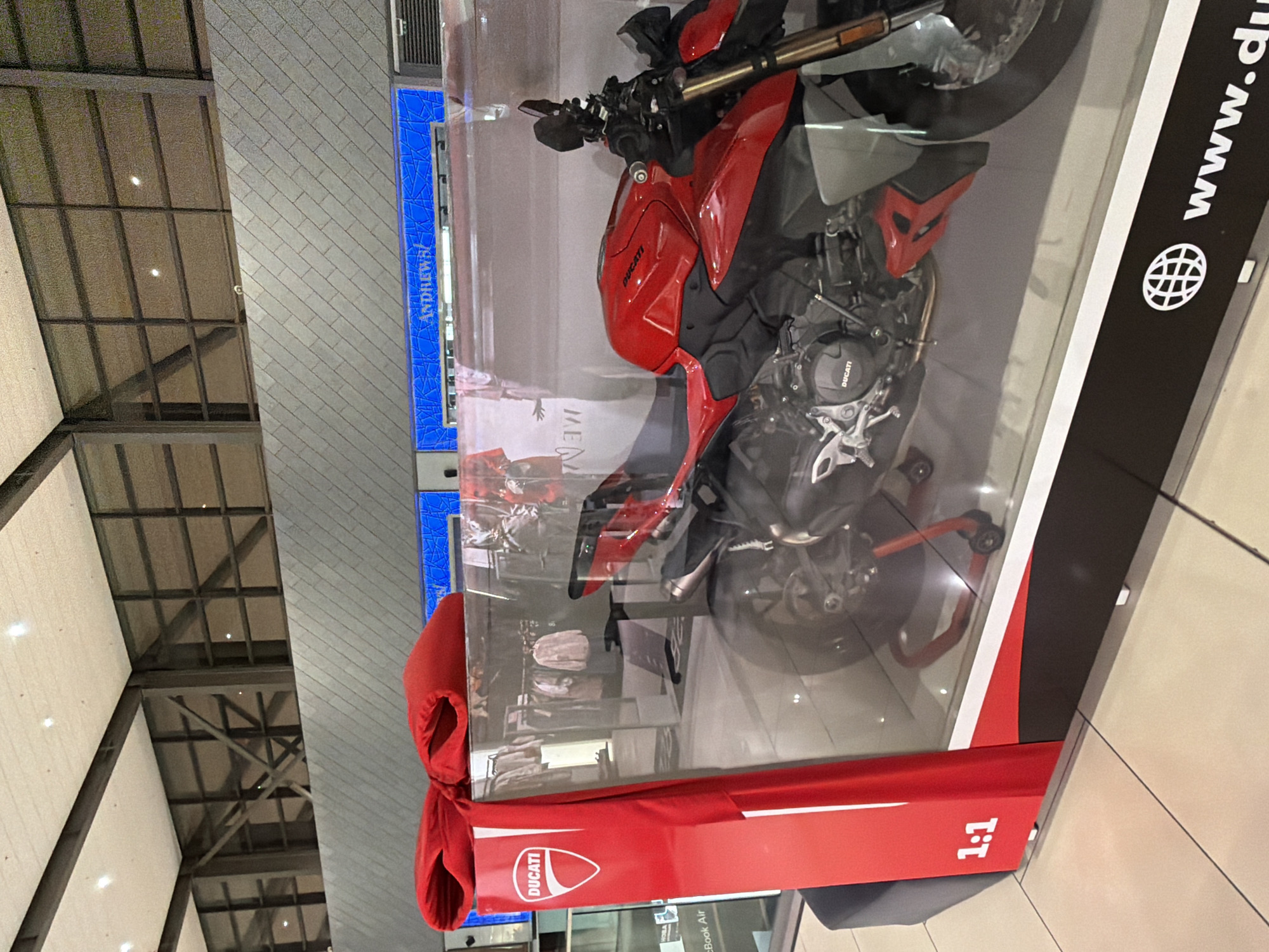 red Ducati motorcycle displayed in a clear case, adorned with a large red bow and the Ducati logo. Text on the case reads "1:1" and "www.ducati.com". The case appears to be located inside an airport terminal, indicated by the architecture and other store display cases reflected in the glass. Additional text, "MacBook Air" is visible in the lower portion of the image. The location is in the city of Unknown, Unknown.