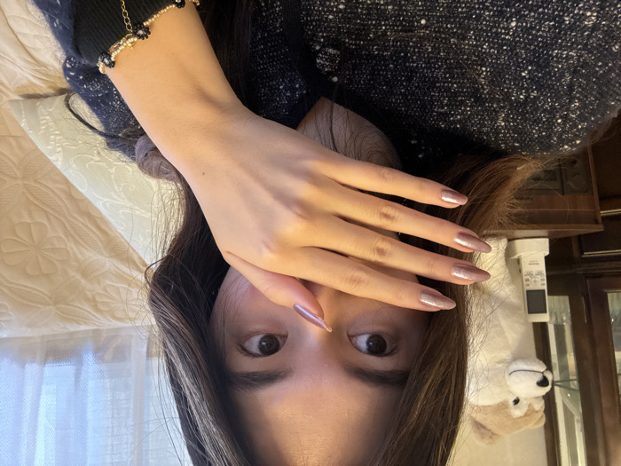A woman with long, dark hair and almond-shaped eyes gazes at the camera from an upside-down perspective, partially obscured by her hand. Her nails are manicured with a metallic pink polish. She is wearing a dark tweed jacket and a beaded bracelet adorns her wrist. In the background is a patterned bedspread, a wooden cabinet, a remote control, and a plush teddy bear.