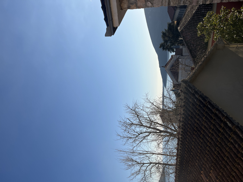 The image presents an elevated outdoor view over the city of Herceg Novi, Montenegro, encompassing a bay and distant mountains under a clear, bright blue sky. The upper two-thirds of the frame are dominated by the cloudless sky, transitioning from a medium blue overhead to a lighter hue near the horizon. In the immediate foreground, a dark, weathered terracotta tiled roof, partially covered in moss, extends from the lower left towards the center. Below this, a segment of a light-colored building with a sloped roof is visible. On the far right, a corner of a stone building with a dark roof gutter and dark-tiled overhang is present. The midground reveals several bare-branched deciduous trees, silhouetted against the bright surface of the bay, which reflects sunlight in numerous shimmering patches. Beyond the trees and between foreground structures, multiple buildings are visible. One prominent structure, centrally located in the midground, exhibits light-colored walls and a distinct roofline, potentially a historical building or church. A few evergreen trees are scattered amongst the other structures. The background features a dark, undulating mountainous landmass stretching horizontally across the far side of the bay, meeting the clear sky at the distant horizon. No individuals or specific activities are observable within the scene.