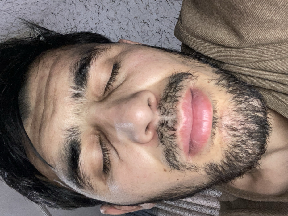 A man is resting with closed eyes. His face is turned slightly to the side. He has dark hair, thick eyebrows, and a dark beard with a mustache. His lips appear full and pink. He is wearing a brown garment. The background is blurry, with a textured surface appearing near his head, while a beige textured material is visible near his chest.