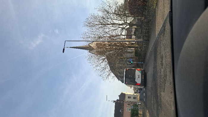 A street scene shows a church with a tall spire partially obscured by bare trees. A bus follows the road, with a traffic light visible above. Buildings line the street, and the sky is light blue. The photograph is taken from inside a car, with part of the dashboard visible.
