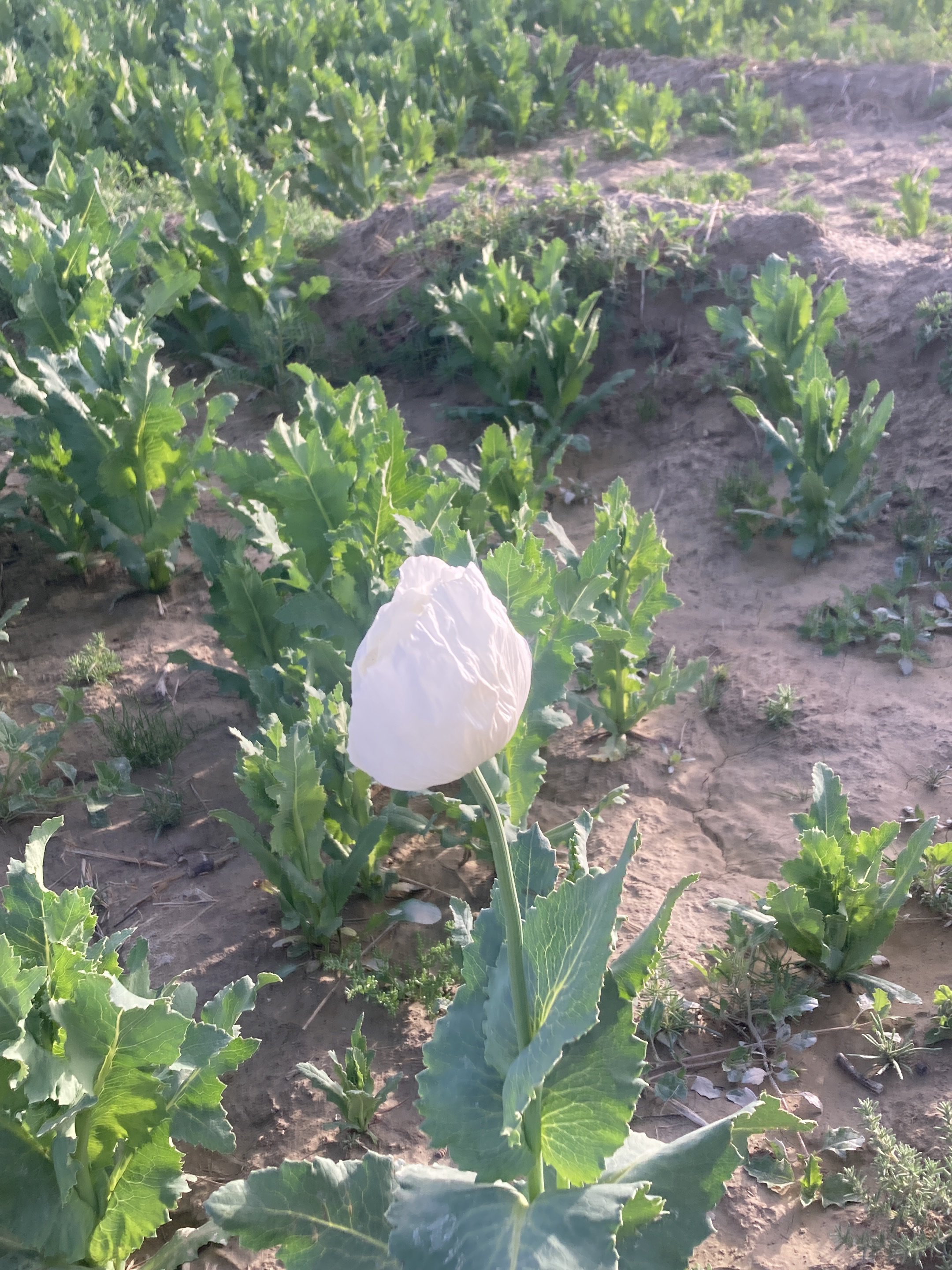 The image depicts a field of opium poppy plants in Hurramzai Tehsil, Pakistan. The plants have distinctive blue-green leaves with serrated edges. In the foreground, a single opium poppy flower is present, its petals still tightly closed, forming a white, bulbous bud. The ground is dry and sparsely covered with vegetation between the rows of poppy plants.
