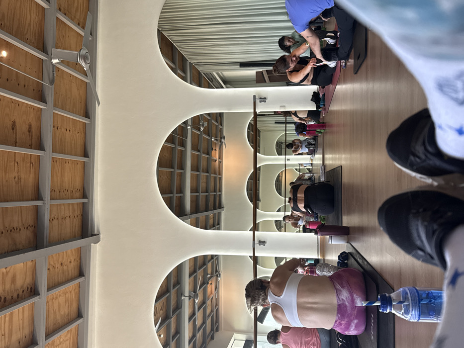 A yoga studio with mirrored walls reflects a class in session. People are exercising on mats, and a few are visible in the foreground. The ceiling has a grid pattern and unique arched architectural details. A ceiling fan is visible. The scene is captured from a slightly angled, ground-level perspective with a water bottle and a person's shoes in the foreground.