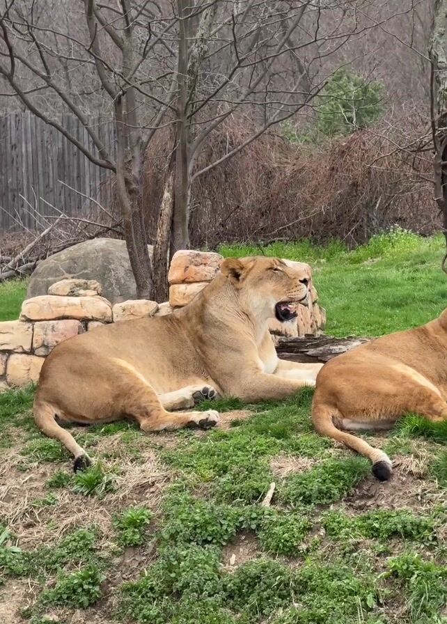 Two lionesses are lounging on a grassy slope. The lioness on the left is yawning, revealing her teeth and tongue. The lioness on the right is lying still with her eyes closed. Behind the lionesses is a stone wall, several bare trees, and a wooden fence. The sky is overcast. The video is shot at eye level. In the background, there are people speaking, seemingly observing the animals.