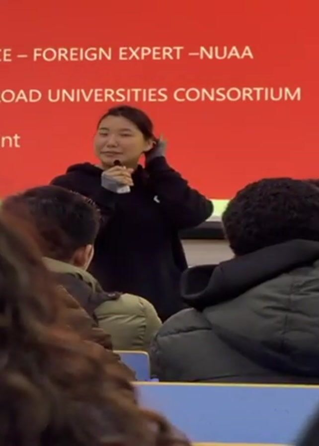A young woman wearing a black hoodie and a face mask is speaking into a microphone in front of a group of people seated in a classroom. A red screen behind her reads "ACE-FOREIGN EXPERT-NUAA" and "BELT AND ROAD UNIVERSITIES CONSORTIUM." The audience consists of several people, mostly young adults, who are seated in rows of blue chairs. The woman is smiling and gesturing with her hands. The overall setting appears to be an academic or educational environment.