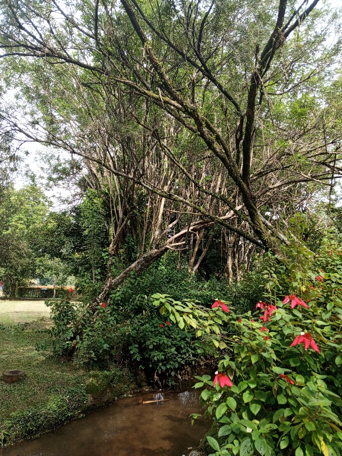 A verdant landscape is bisected by a small stream with brownish water. Lush greenery dominates, featuring vibrant green leaves and striking red flowers in the foreground. A cluster of slender trees with bare branches reaches towards the sky, their forms contrasting with the dense foliage below. A patch of grassy lawn extends into the distance, bordered by shrubbery, adding depth to the scene.