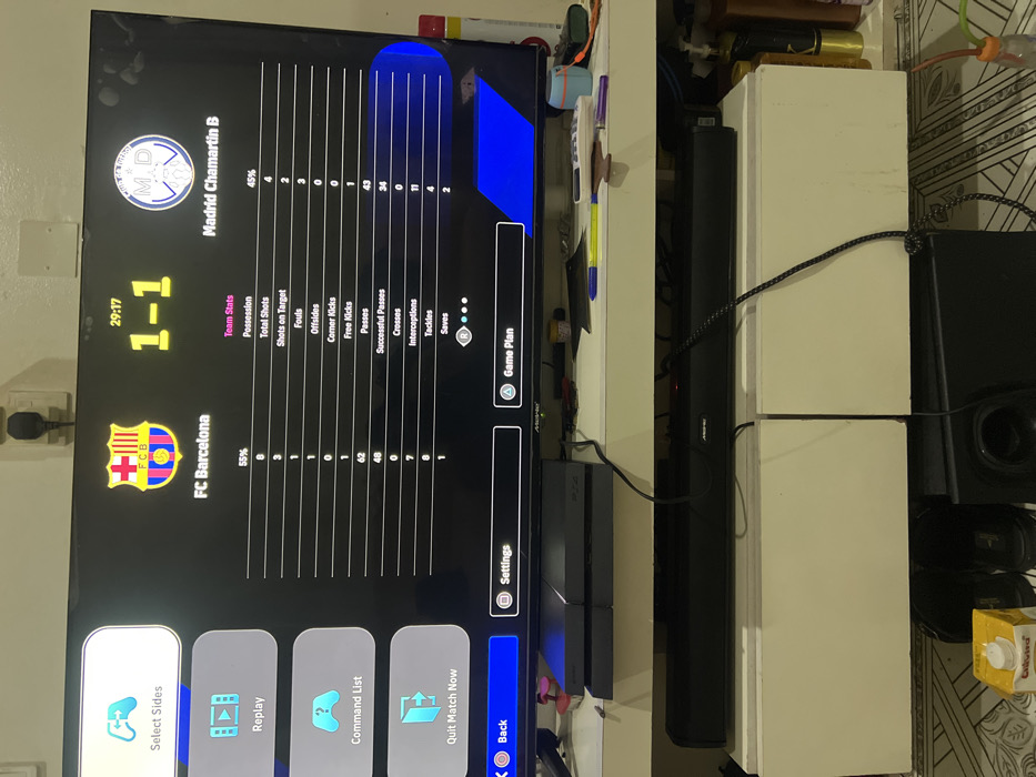 A television screen shows a soccer video game in progress. The score is tied 1-1 at the 29:17 mark. FC Barcelona has 55% possession and 8 total shots, while Madrid Chamartin B has 45% possession and 4 total shots. Other game statistics like shots on target, fouls, and successful passes are displayed. Options like “Select Sides,” “Replay,” and “Quit Match Now” are visible. "Game Plan" and "Settings" can also be seen on the screen.