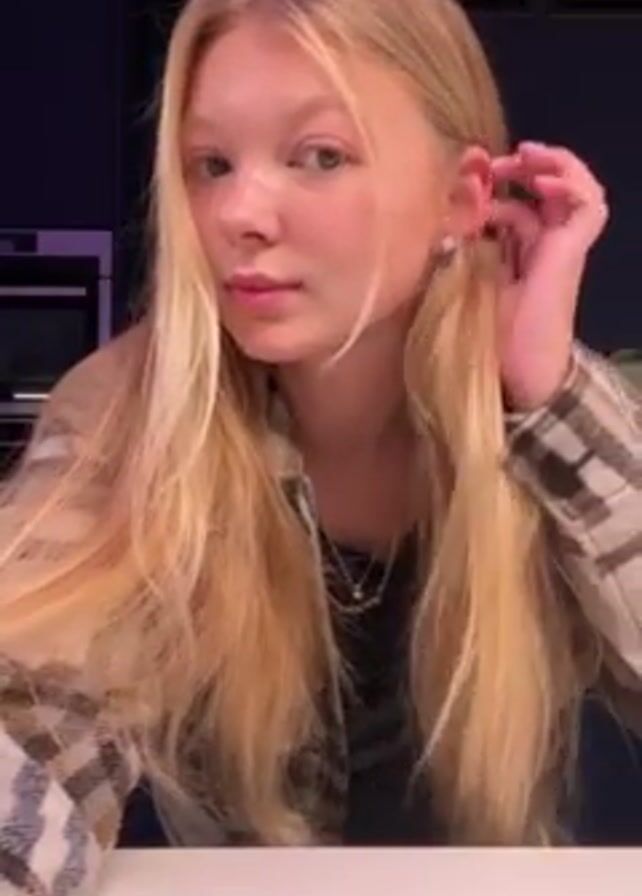 A young woman with long blonde hair, wearing a plaid shirt and necklace, sits at a white table and looks at the camera. She smiles slightly at the beginning of the video. She touches her hair with her right hand. A kitchen is visible in the background with dark cabinets and a microwave or oven. A voice speaks in the background, but the words are not discernible.