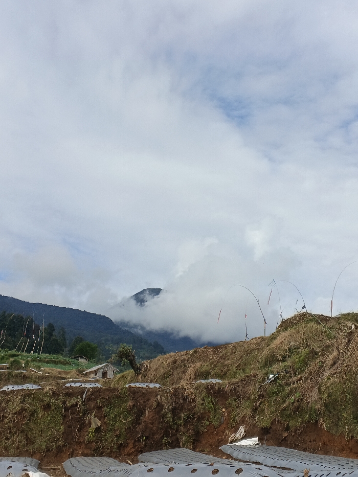 A landscape with a mountain partially obscured by clouds dominates the background. A small house is nestled among trees and greenery on the lower slopes. In the foreground, terraced hillsides display exposed soil and patches of dry grass. Rows of white plastic sheeting, presumably for agriculture, cover some of the land. Thin, curved poles with small flags or ribbons are planted along the hillside crest. The sky is overcast with a mix of white and gray clouds.