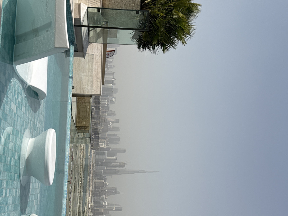 The image displays an elevated view of an outdoor infinity pool in Dubai, United Arab Emirates, overlooking the city's skyline, with the Burj Khalifa prominently visible in the distance. In the foreground, a light blue tiled infinity pool contains clear water. Partially submerged on the left side of the pool is a white, ergonomically shaped lounge chair. On the right side, a white, round pedestal table is also partially submerged. Both items appear to be unoccupied. The mid-ground features the pool's edge, a light-colored building structure, and a glass safety railing running horizontally. To the far left, a large planter holds a vibrant green palm tree. Behind the glass railing, a small orange and white flag or banner is partially discernible. The background reveals the dense urban skyline of Dubai under a hazy, light blue sky. Numerous modern high-rise skyscrapers populate the horizon. The Burj Khalifa, the world's tallest building, stands slightly right of the frame's center, its upper spire somewhat softened by atmospheric haze. Undeveloped sandy areas or construction sites, possibly bordered by water, are visible between the immediate structures and the distant city. The scene is static, devoid of any visible individuals, and illuminated by bright daytime sunlight, contributing to the atmospheric haze.