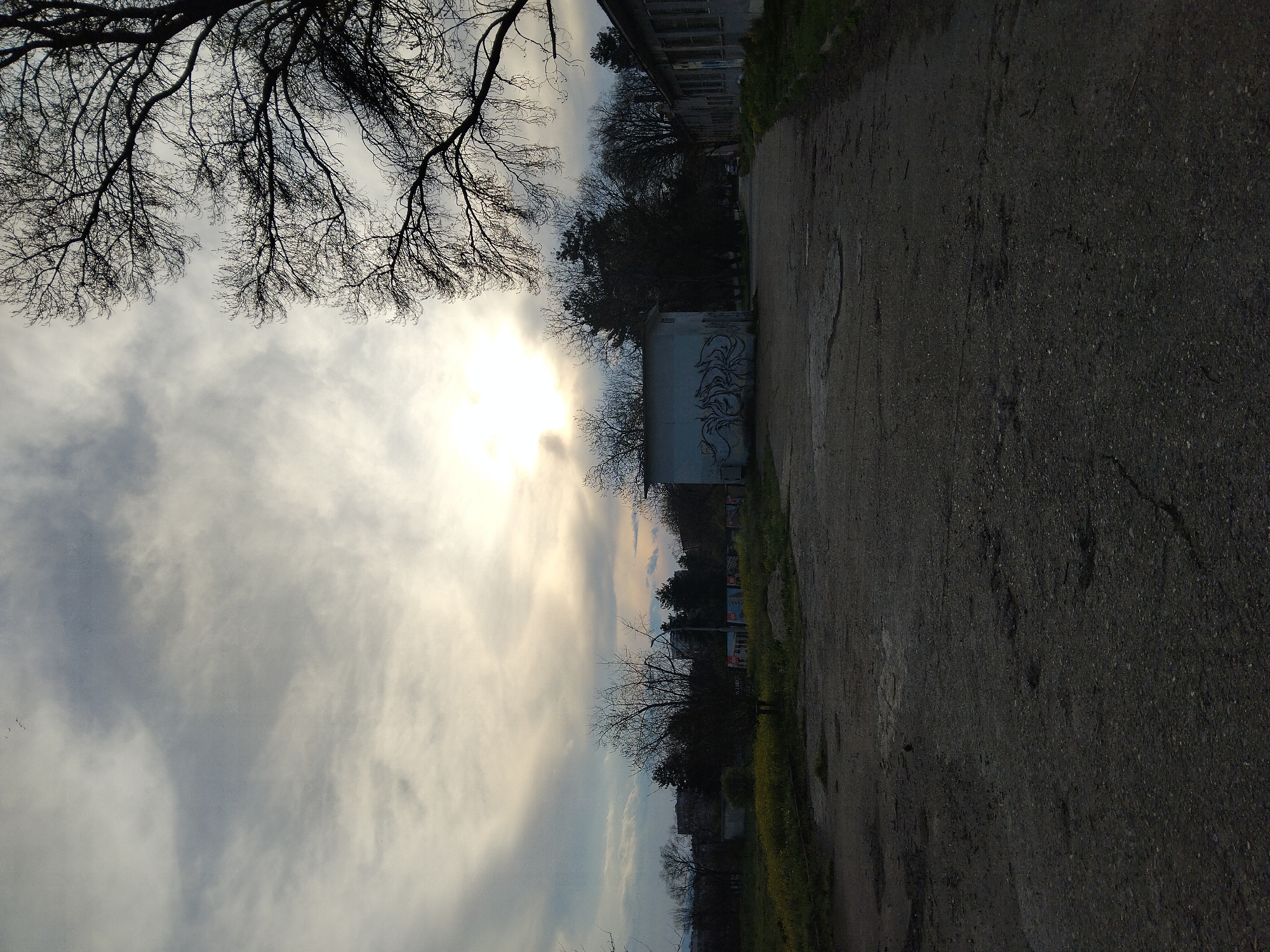 The image depicts a street scene in Kazanlak, Bulgaria, with a narrow asphalt road occupying the right side of the frame. The left side shows a cloudy sky with a bare tree branch in the upper left corner. A building with graffiti is visible along the road. Other buildings, trees, and vegetation line the road, creating a partially obscured view. The sun is behind the trees in the middle.