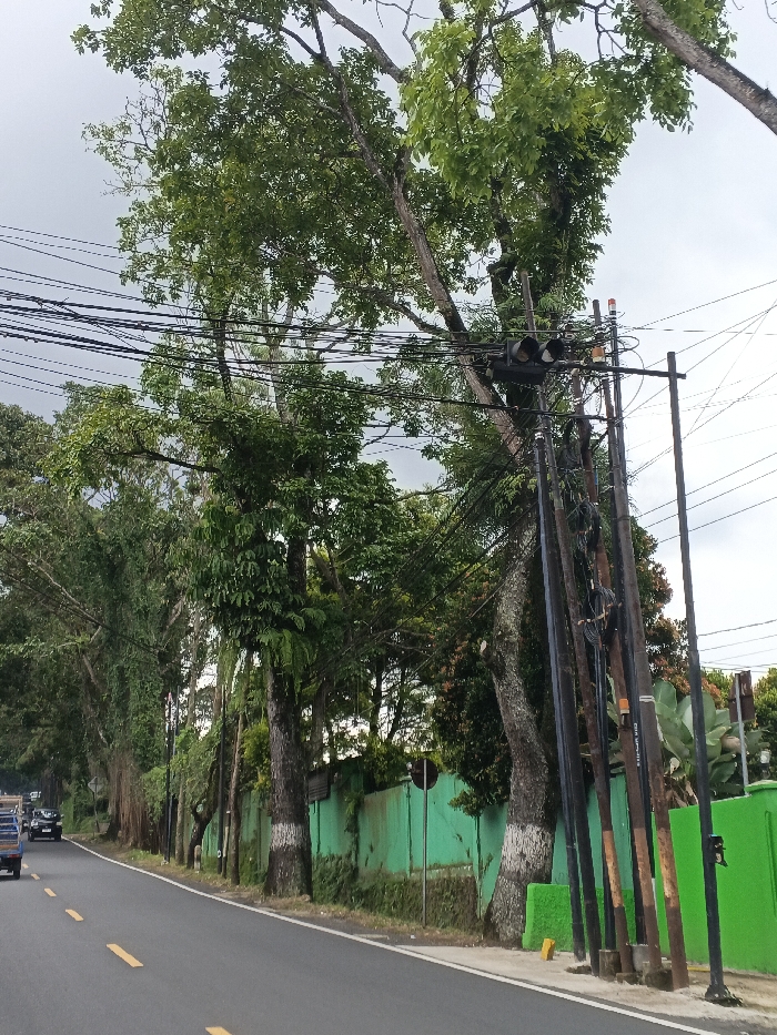 The image presents a roadside scene in the City of Kalipayan, Philippines, under an overcast sky. A dark asphalt road, marked by double solid yellow lines towards the left and a single solid white line defining the right shoulder, extends into the background where two light-colored vehicles are partially visible. Along the right side of the road, a dense line of mature trees with green foliage stands, several exhibiting white paint on their lower trunks. A cluster of at least five dark utility poles rises along the roadside, supporting a dense network of black overhead electrical and communication wires. A dark two-section traffic light, displaying a visible amber lens and an adjacent dark or red lens, is affixed to one of these utility poles. Immediately behind the trees and utility poles, a prominent, textured bright green wall, partially covered with climbing vegetation, stretches horizontally. A black circular sign on a pole is discernible against this green wall. Yellow concrete blocks are present at the base of some utility poles. No human subjects are visible within the frame.