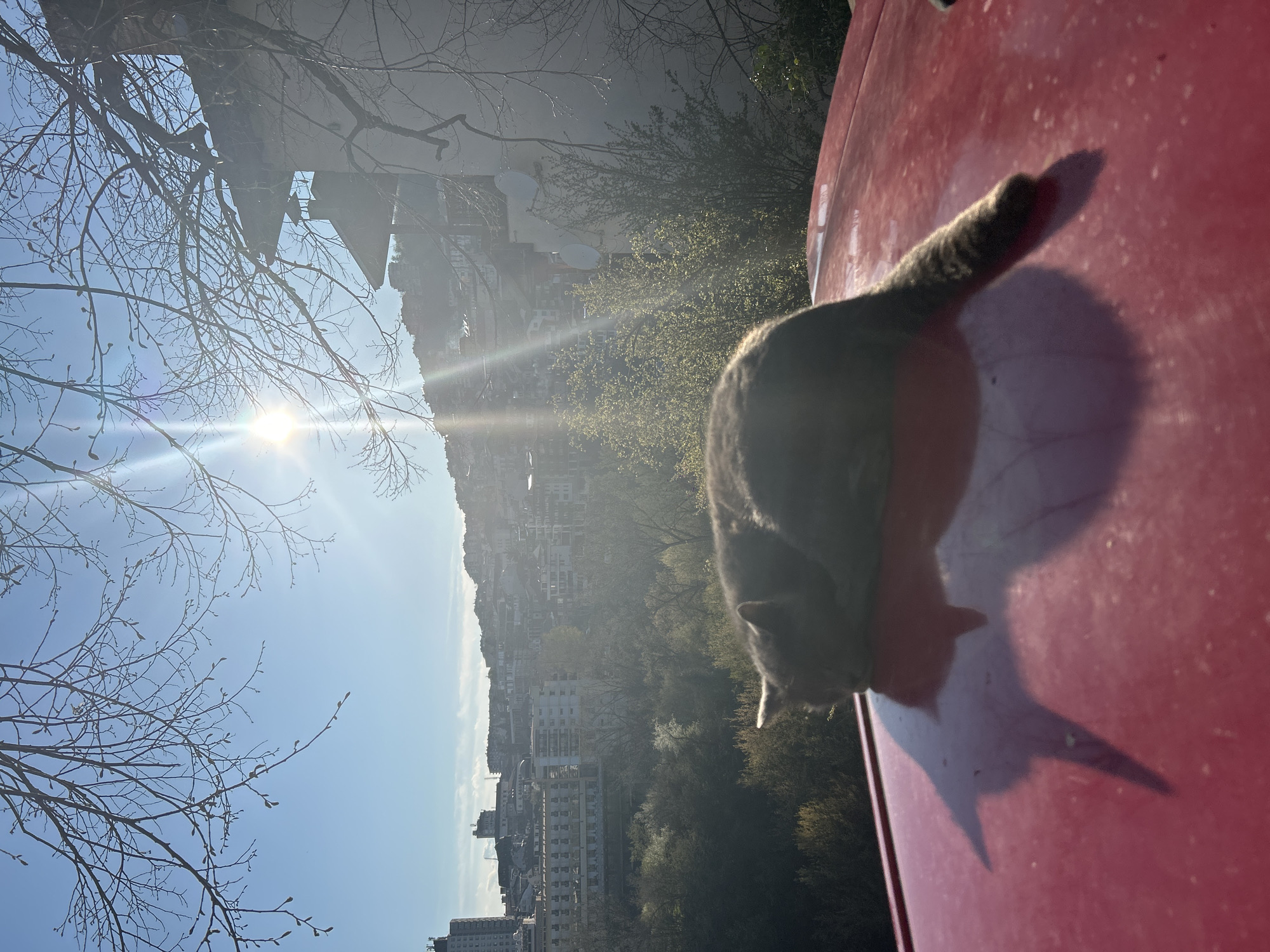 A medium shot of a grey tabby cat lying on a red surface, seemingly a car hood, in front of a cityscape in Veliko Tarnovo, Bulgaria. The cat is positioned towards the upper right, with its head pointing downwards and tail extending upwards. The surrounding environment includes bare tree branches against a bright blue sky and a cityscape blurred by sunlight and haze. The buildings are densely packed, appearing to slope downwards towards a lower elevation. The overall lighting suggests it is a sunny day, creating strong shadows and highlights.