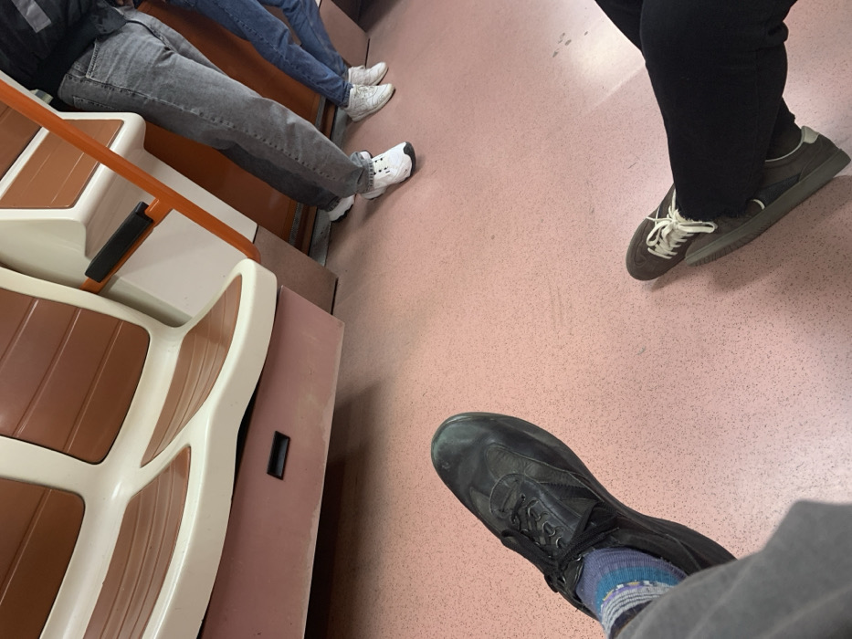 four pairs of legs and shoes in an indoor setting, possibly public transport. Two people are seated with their legs extended in front. The first has on light gray jeans and white shoes; the second wears blue jeans and light-colored sneakers. A third person is standing with black pants and brown sneakers. A fourth person is standing with on gray pants, colorful striped socks, and black shoes. The floor is a light pink color. Seats are visible to the left side of the frame.