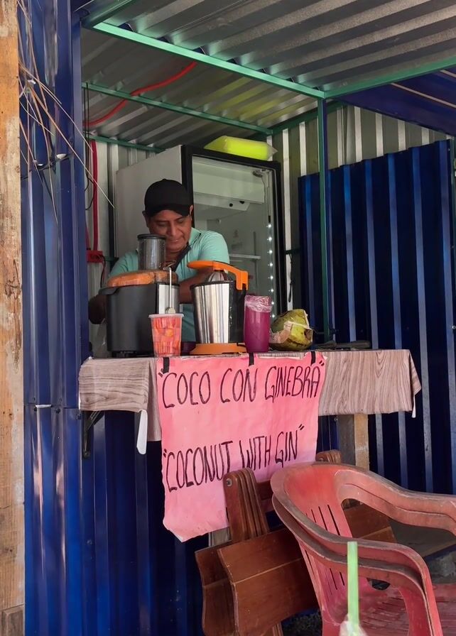 A man stands inside a small, makeshift booth, preparing drinks. He is wearing a baseball cap and a light blue shirt. In front of him is a counter with a sign that reads "COCO CON GINEBRA" and "COCONUT WITH GIN." There are cups, blenders, and coconuts on the counter. Behind the man is a small refrigerator. The booth is constructed from blue corrugated metal sheets. In front of the booth, there are several red and brown chairs stacked together. The video appears to be a static shot, focusing on the man and his drink preparation area.