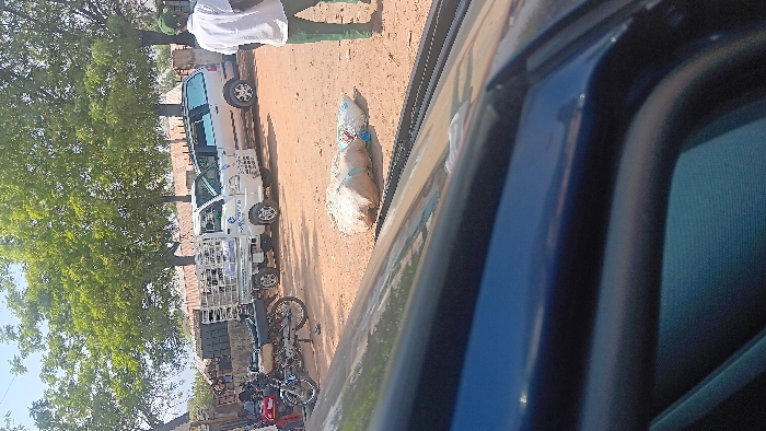 The image displays an outdoor scene in Langtang, Nigeria, under clear daytime conditions. The immediate foreground is obscured by the dark blue upper edge of a vehicle. The midground features a reddish-brown dirt surface where two large, light-colored sacks, one secured with a light blue strap, are resting. To the left, two motorcycles are parked, one with a visible red fuel tank. Adjacent to the motorcycles, a white utility truck with a caged bed containing multiple white packages or containers is parked. Behind the utility truck, a silver or light-colored SUV is also parked. On the far right, a male subject is observed from the rear, standing or walking, dressed in a white short-sleeved shirt, dark green trousers, and a dark green cap. The background consists of dense green trees and low-rise structures with corrugated metal roofs, under a bright, cloudless sky.