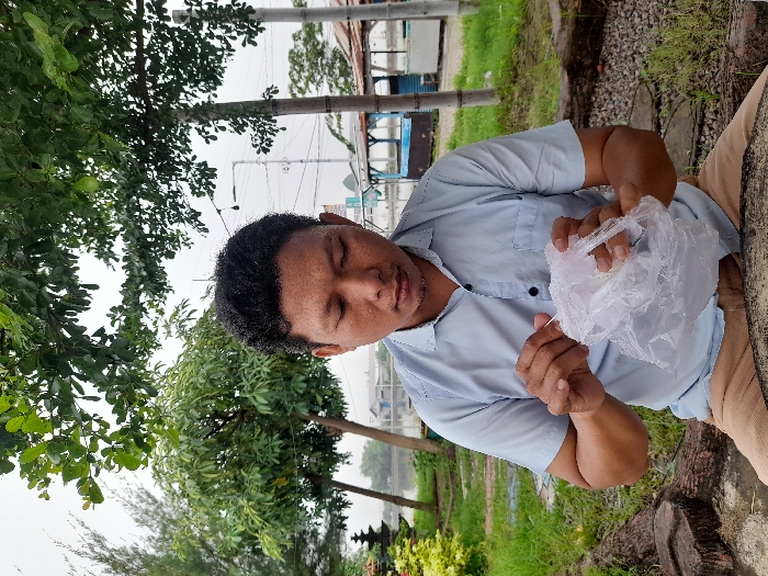 A man wearing a light blue button-down shirt is seated outdoors with trees and a building in the background. He holds a crumpled plastic bag in his hands, with a small white stick protruding from it. The man's gaze is focused downwards towards the bag, suggesting he is examining or manipulating something inside. The setting appears to be a park or garden area, with a natural and slightly overcast lighting.