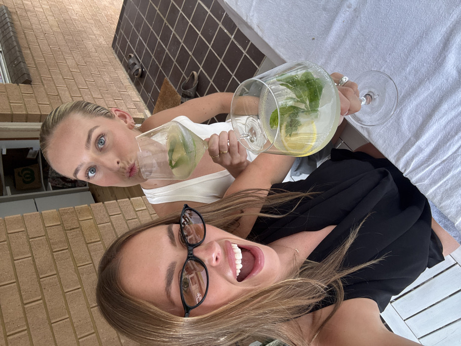 Two young women pose for a selfie, holding large glasses filled with a clear beverage, lemon slices, and mint leaves. The woman in the foreground smiles widely, wearing black-framed glasses and a black top. The woman behind her puckers her lips, wearing a white tank top. They appear to be outdoors on a patio, with a white tablecloth visible in the background. The setting includes brick walls and outdoor decor.
