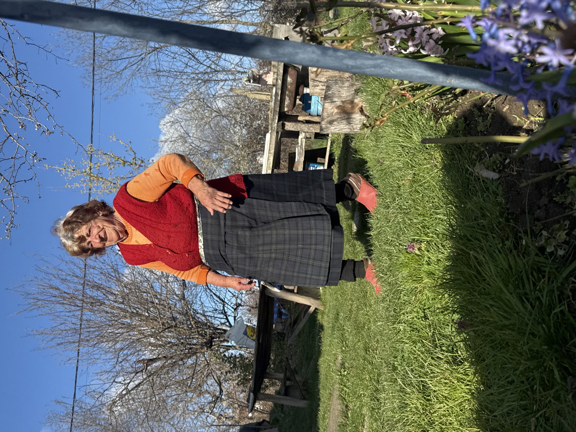 An elderly woman stands outdoors in a grassy area in Bardarevo, Bulgaria, under a clear blue sky with some scattered white clouds. She is positioned slightly to the right of the frame's center, facing the camera directly with a smile. She has light brown hair with visible grey, and her complexion appears weathered. Her attire consists of an orange long-sleeved shirt worn beneath a red, possibly knitted, button-up vest. She wears a dark plaid skirt over black leggings and red shoes or slippers, with striped socks visible. Her hands are relaxed at her sides. The foreground is dominated by vibrant green grass. In the lower right, out-of-focus purple and light pink hyacinths are visible, with a blue pole or stake partially obscuring them. In the midground, behind the woman to her left, a rustic wooden table or workbench stands. A white plastic bag, possibly branded, and other indistinct items are on its surface. To the right of the table, a wooden tree stump and a blue container are discernible. The background features numerous deciduous trees with bare branches, suggesting late winter or early spring. A thin black electrical wire traverses the upper portion of the background. The scene is illuminated by bright sunlight, casting visible shadows on the grass.