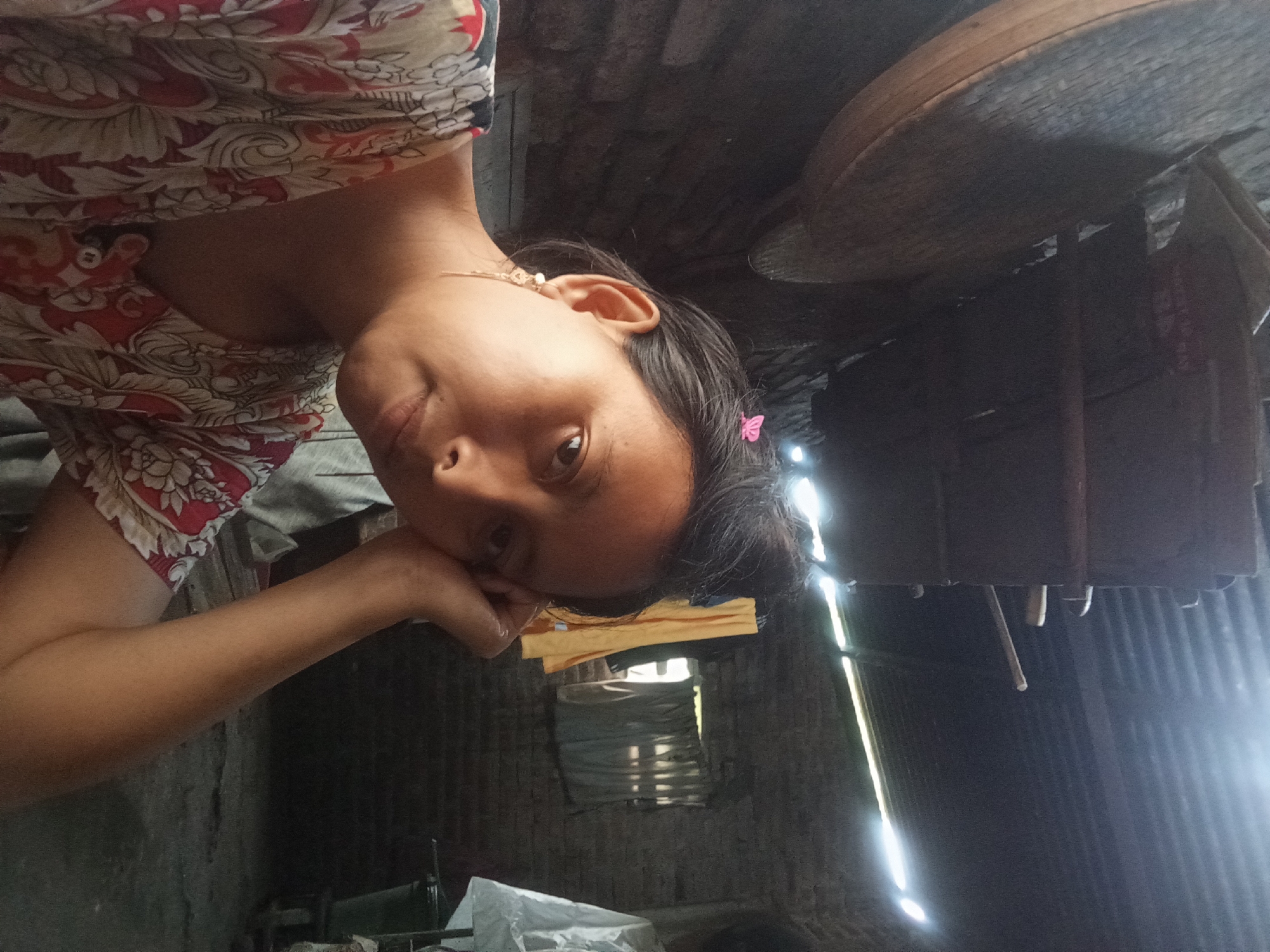 A woman is depicted in a medium shot, seated indoors in Baron, Indonesia, looking directly at the viewer with a neutral expression. She has dark hair styled in an upward bun, secured with a small pink butterfly clip. She wears a light-colored top featuring a prominent red and white floral or paisley pattern. A gold-toned dangling earring is visible on her right earlobe, and her right hand is positioned under her chin, supporting her head. The indoor environment features dark, rough-textured walls, possibly brick or stone, and a corrugated metal ceiling. Bright natural light streams in from openings above the right wall and through a window opening covered by a light-colored curtain. A large, round, wooden object is partially visible on the upper left wall. In the background to the right, a yellow piece of fabric hangs near the window, and a white cloth is draped over an unseen object, adjacent to a dark green bucket or container. The floor is dark and uneven.