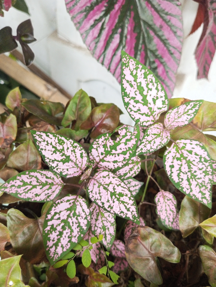 The image showcases a vibrant collection of indoor plants. A striking Polka Dot Plant (Hypoestes phyllostachya) with green leaves speckled with bright pink dominates the view. This is complemented by pink and green Begonia maculata. Arrowhead plant are nestled in the base. The plants are potted in a small container. The diversity in textures and hues creates a lively and visually appealing arrangement.