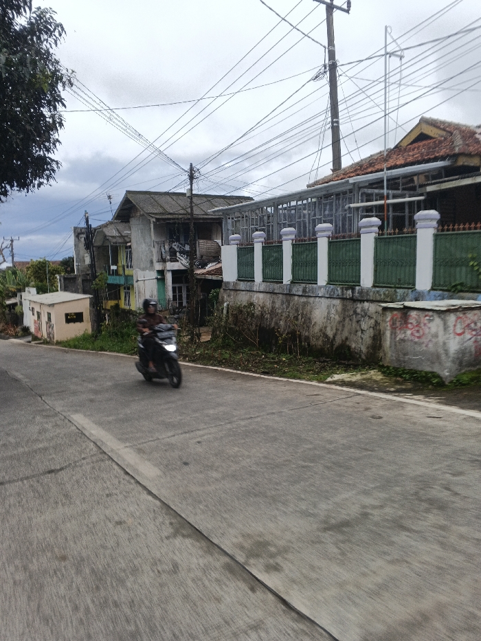 A dark-colored scooter, operated by an individual wearing a dark shirt and helmet, travels on a gray paved road under an overcast sky. The specified location of Masaiti, Zambia, cannot be visually confirmed by the image. On the right side of the road, a concrete retaining wall with green moss and red graffiti supports a fence featuring white pillars and green metal railings. Behind the fence, buildings include one with a reddish-brown tiled roof and exposed metal framing, suggesting construction or renovation, and another multi-story structure with a dark corrugated roof. On the left, further down the road, a small, light-brown building with an illegible sign and additional residential-style structures are visible. Multiple utility poles support a dense network of overhead power and communication lines that crisscross the sky. A dark tree canopy is present in the upper left quadrant. Sparse vegetation grows along the roadside, indicating an urban or semi-urban environment.