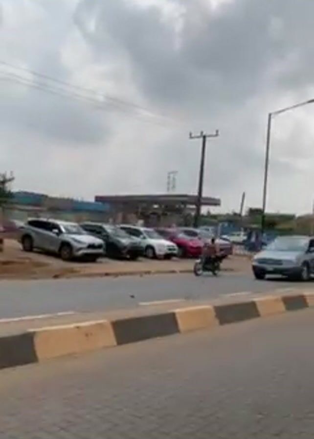 view of a street on a cloudy day. The street is paved with bricks and has a yellow and gray curb. There is a gas station on one side of the street with several cars parked nearby. Other buildings and shops are visible in the distance. Power lines and streetlights run along the street. A blue minivan drives across the shot. The scene appears to be set in a suburban or semi-urban area.