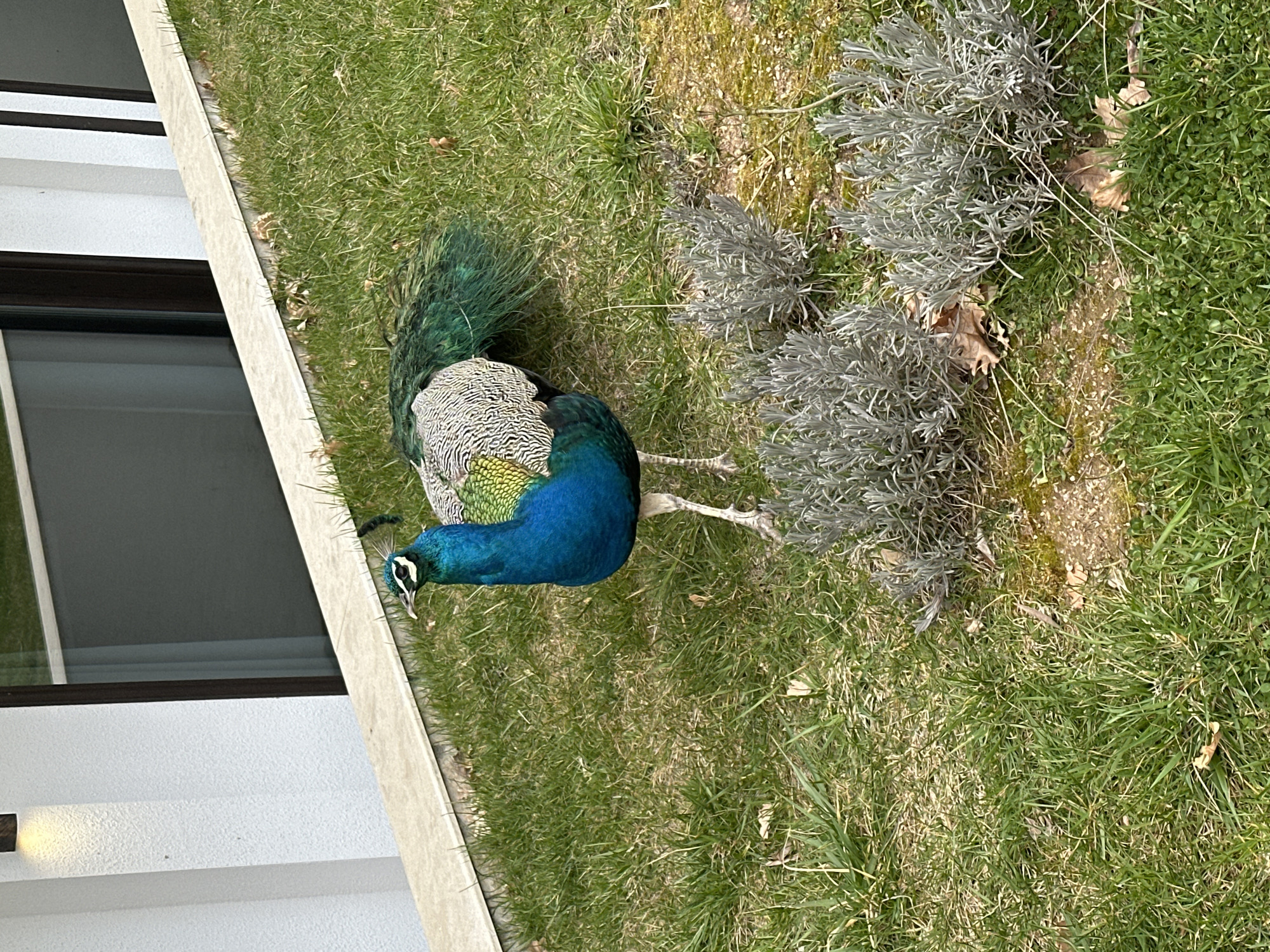 The image captures a male peacock standing on a grassy area in Krasnovo, Bulgaria. The bird, positioned centrally and facing left, features a vibrant blue head and neck, a white crescent below the eye, a short dark crest, and a back displaying iridescent green and gold scaled plumage leading to long, dark green tail feathers. Its legs are light gray. The ground consists of green grass with occasional patches of exposed soil and scattered dry brown leaves. Several clusters of low-growing, silver-gray foliage plants are present in the lower right. A light gray concrete ledge or border extends horizontally across the background, separating the grass from a modern building. The building wall is white and textured, with a large, dark-framed window occupying the upper right portion of the background. A dark, rectangular outdoor wall light fixture is mounted on the white wall in the upper left corner.