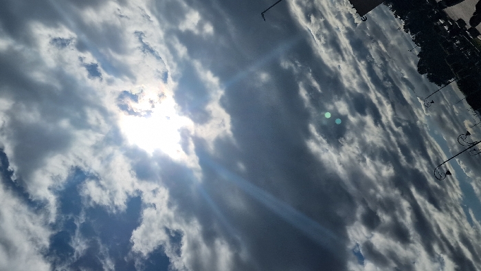 - "The image displays an upward-angled view of a partially cloudy sky with the sun brightly shining from behind dense grey clouds in the upper left quadrant" by FM-8KqvX2, licensed under CC BY 4.0